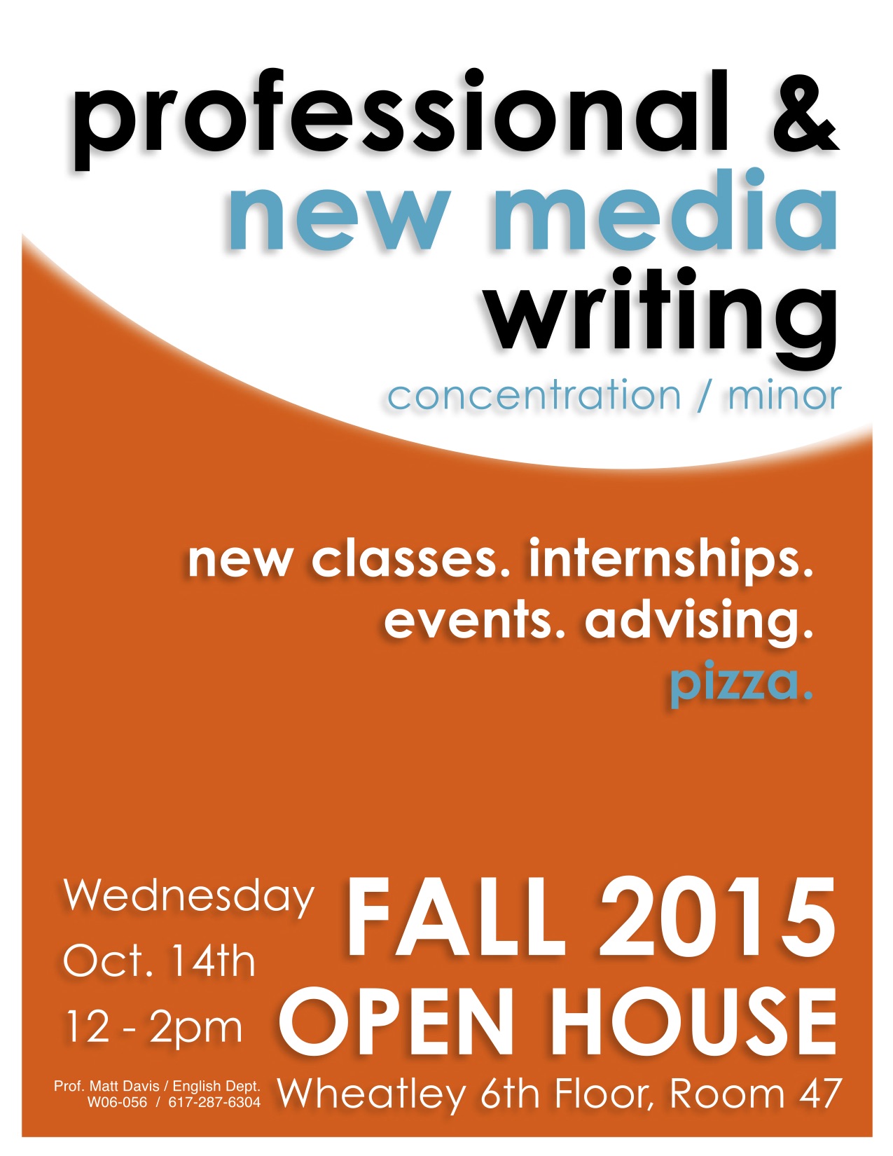 e by anytime between 12-2pm on Wed. October 14th (W6.47) to walk around, get caught up on what’s new, and enjoy some pizza.This year we’ll have different stations set up around the room, each with info you won’t want to miss as a PW student. Learn about new classes, upcoming events, opportunities, student media, contests & more! Plus, we’ve teamed up with the Communications department, WritLarge, and The Watermark to offer you more opportunities than ever before. Come meet their representatives to learn more about how you can get involved, network, and maybe even see your name in print.